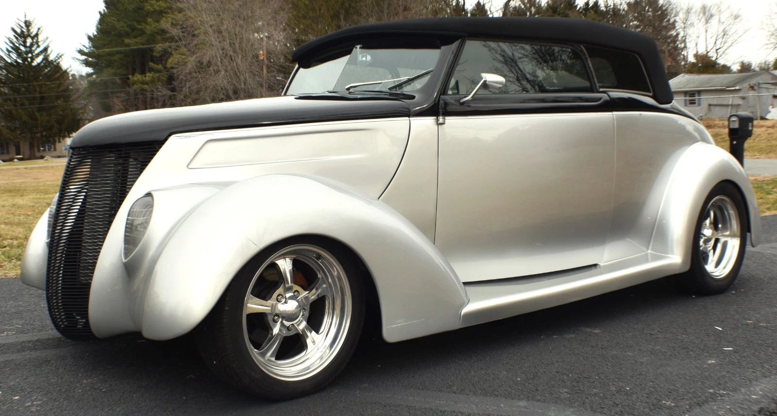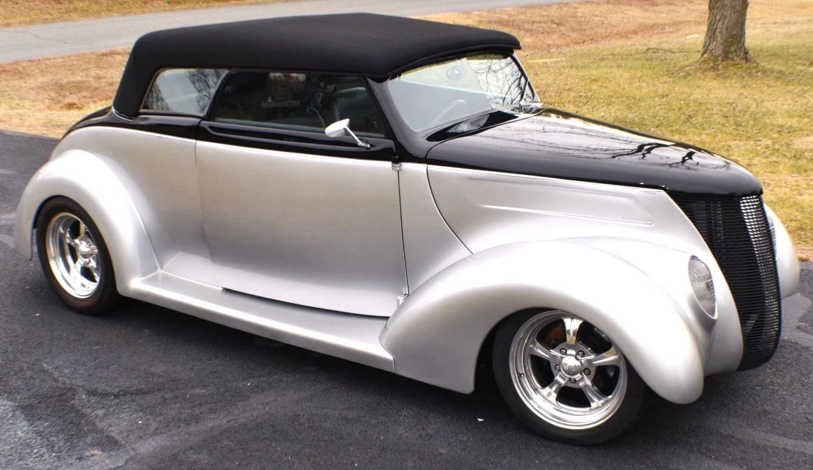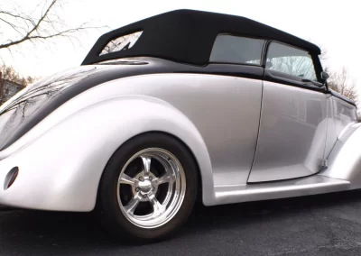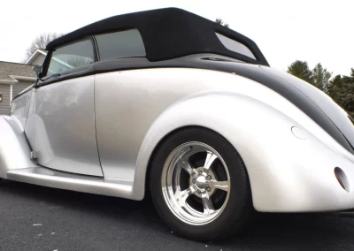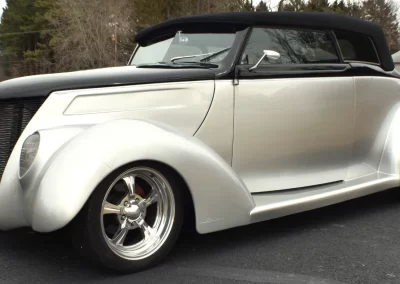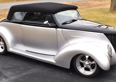 1937 Ford Cabriolet Street Rod with a 3” chopped Carson style removeable top. The body is fiberglass by Gibbons with a square tube frame. Exact date of the build is estimated to be early 2000’s and it has only logged just under 10,000 miles on the odometer. Power comes from a 350 cu in Chevy V-8 backed by a 200R4 4-speed automatic transmission, and 9” Ford rear differential. Present owner purchased the car from a dealer approximately 8 years ago without any accompanying documentation of the build. Recent work includes new Radio (with Bluetooth), A/C and cooling system.