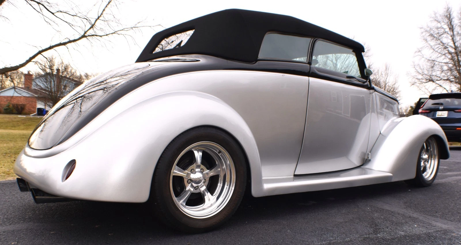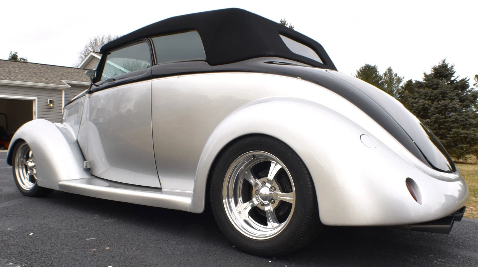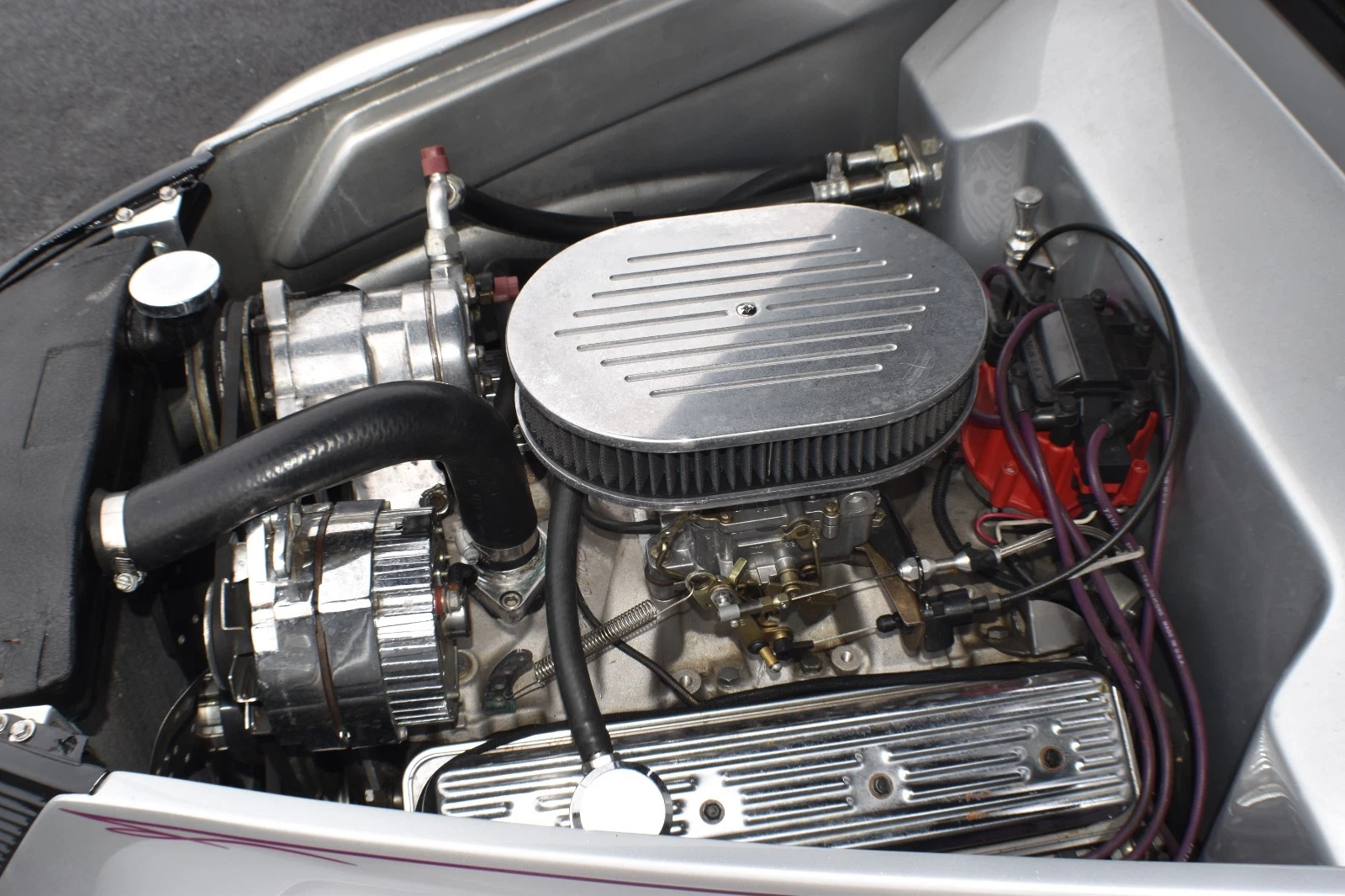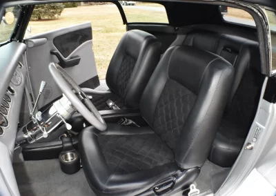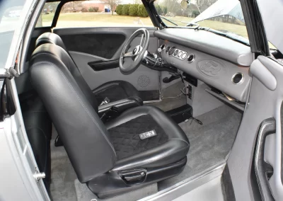 Gibbons ‘glass body with one-piece removeable Carson style top which is covered in Haartz cloth (like Mercedes-Benz convertibles). Paint is a 2-stage urethane in a silver metallic with pearl essence and black from the beltline up. Door poppers open both doors (no emergency release underneath). Trunk opens with an electric motor using a switch located on the passenger side of the dash. There is a clear 3M film on the front fenders to prevent chipping. All exterior lights, including brake and turn signals work. Body does show some age-related scratches and there is a crack in the right-hand section of the 2-part windshield (see photo). Hood needs a prop rod. Please view all photos.