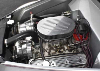 Chevrolet 350 cu. in. V-8 with Vortec cylinder heads, Edelbrock Performer intake manifold with a 650-cfm carburetor. It appears to have a ‘lumpy’ hydraulic cam, headers, FlowMaster mufflers w/dual exhaust. Ignition is an HEI unit. New aluminum radiator and Vintage Air A/C & heat system.