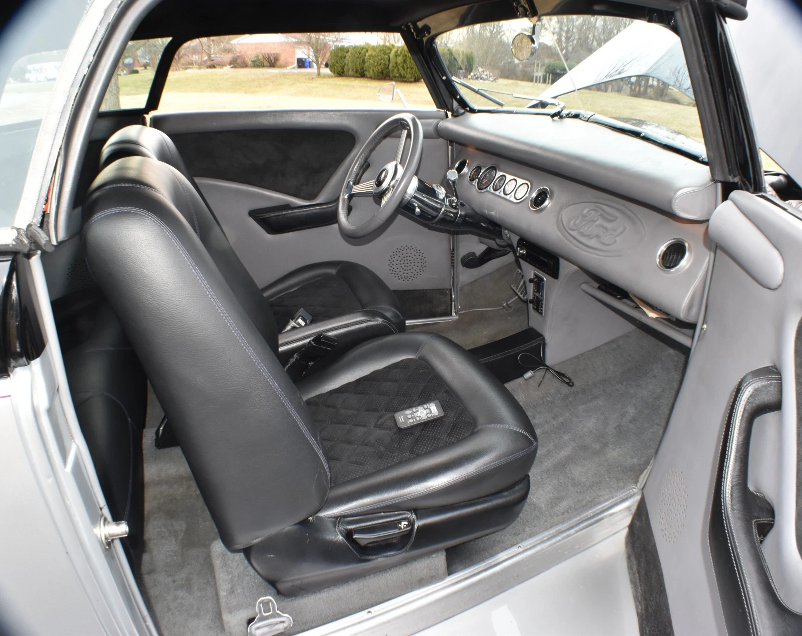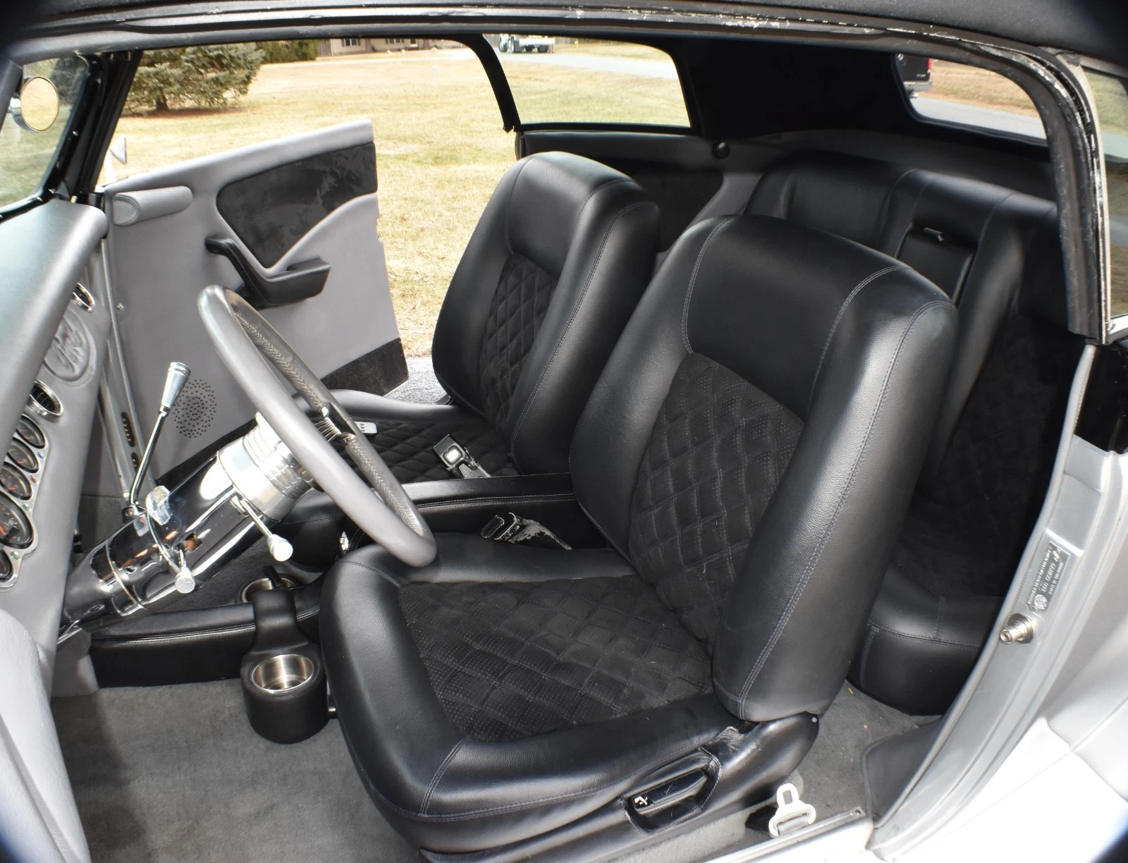 Gray and black vinyl upholstery is tastefully done and uses cloth inserts for accents. Does not appear to be any stains, tears, or rips in the upholstery. New stereo system was recently installed with Bluetooth and microphone. VDO gauges include fuel, speedometer/odometer, water temperature, oil pressure, and voltmeter.