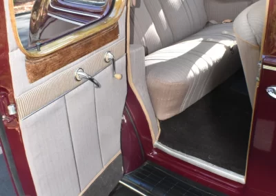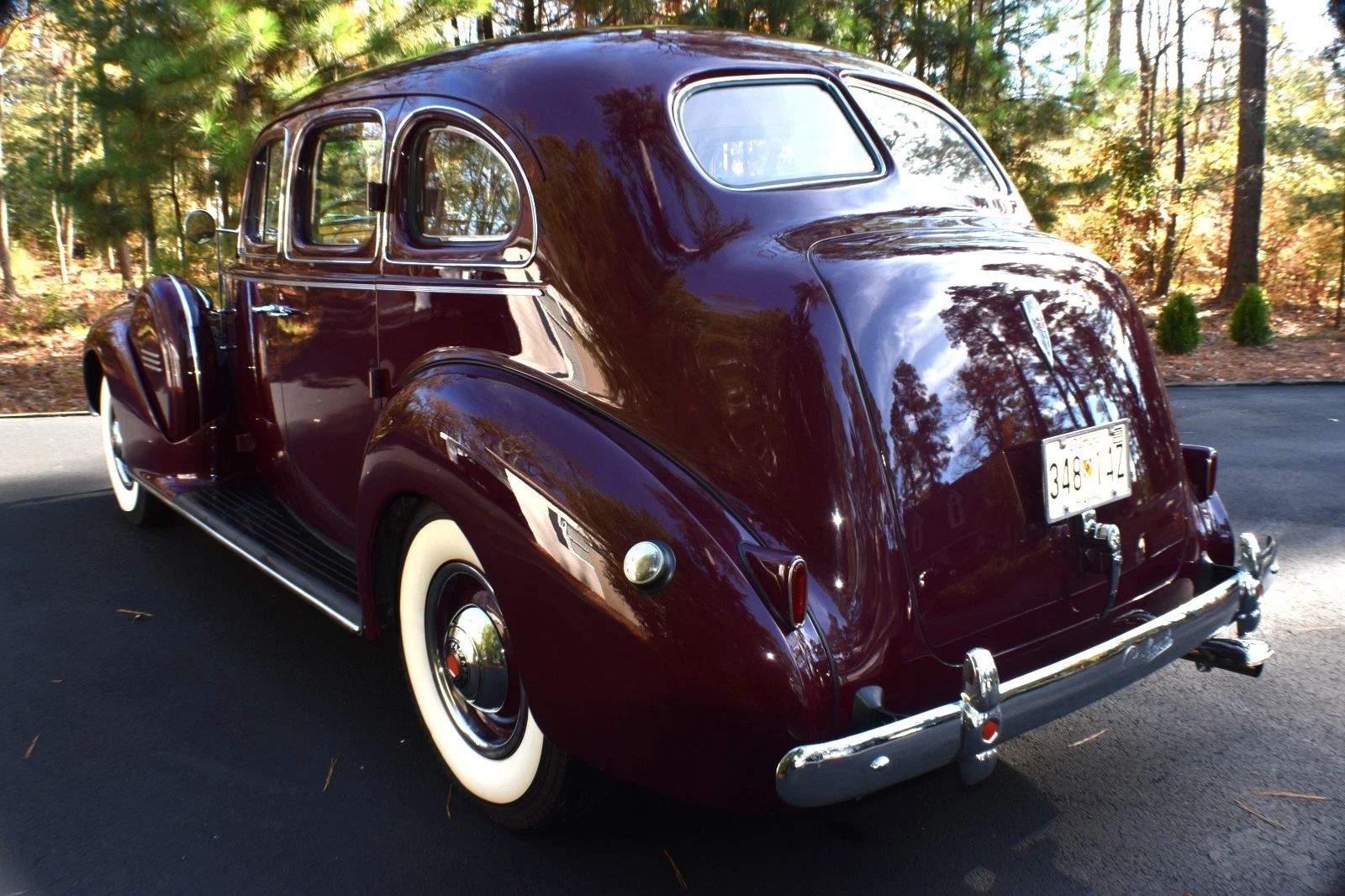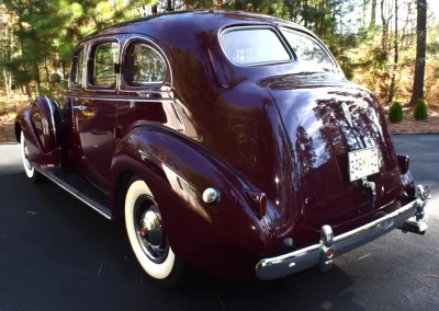 Beautifully restored 1940 Packard Model 120 4-door sedan with dual side mounts and repainted in the original color of Laguna Maroon Metallic. It is powered by the original 282 cu. in. flathead ‘straight 8’ engine rated at 120 horsepower and backed by the matching 3-speed manual transmission. Total mileage since its completion is estimated at 5,000.
