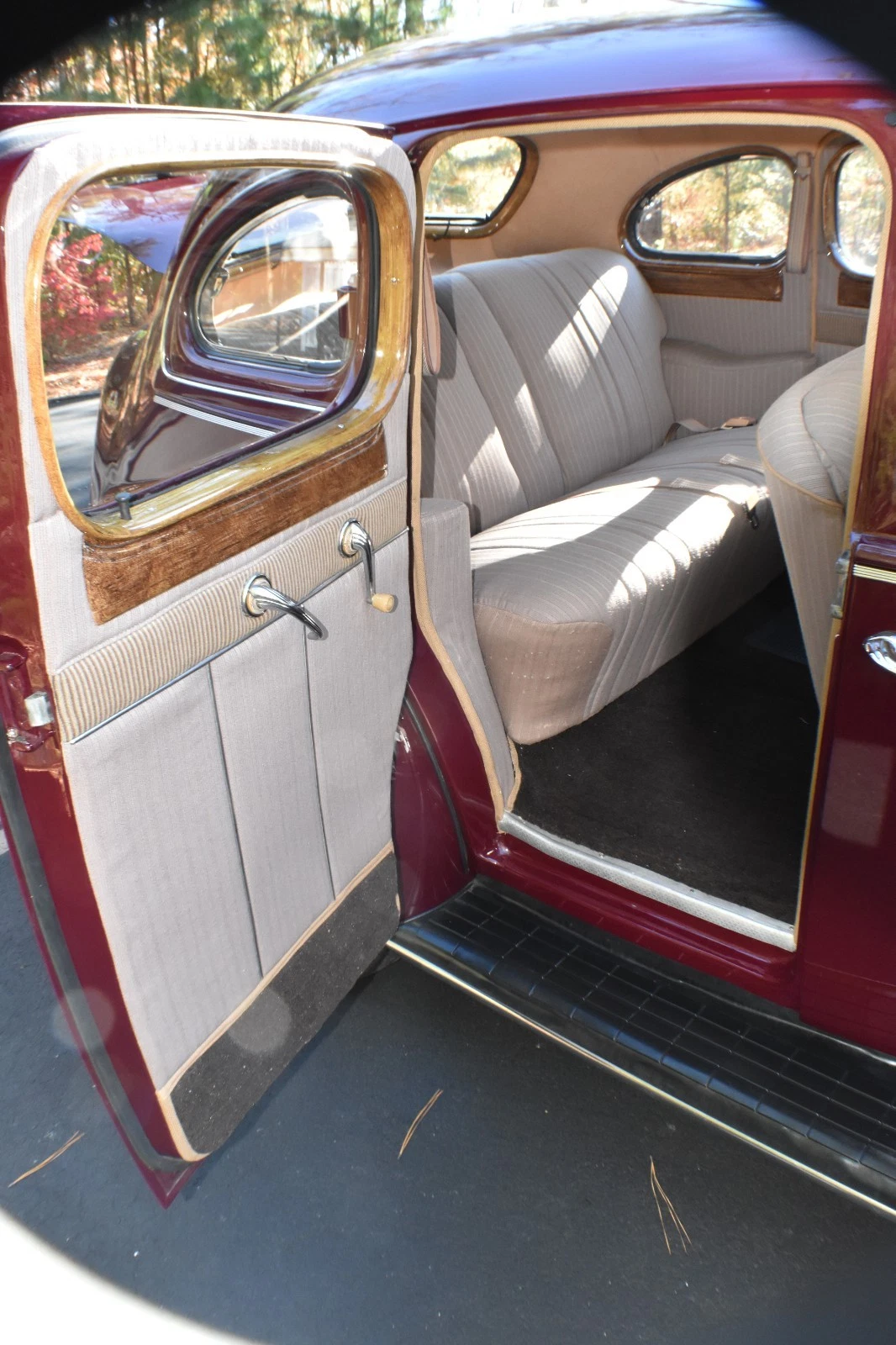 The interior is beautiful and redone in the original style of wool broadcloth and wood grain finish on the dashboard and trim. The Packard was converted to 12-volt and uses aftermarket fuel and tachometer gauges. The factory speedometer/odometer, oil pressure, and water temperature gauges function. The clock, radio, and original fuel gauge do not.