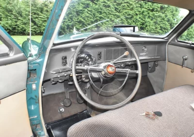 The interior was restored in the original cloth material and looks excellent. The dashboard shows very well and all the factory gauges and options work, including the vacuum wipers. Only the clock does not function. The radio was upgraded to an AM/FM unit and uses the outside antenna for reception.