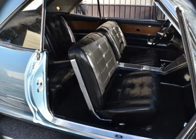 The interior appears to be very original except for the carpeting, front seats, and a console panel on the passenger side. The seats were reupholstered in the factory pattern. The factory gauges function (except the speedo/odometer) including the AM radio, power antenna, power windows, and power seats. The clock does not work.