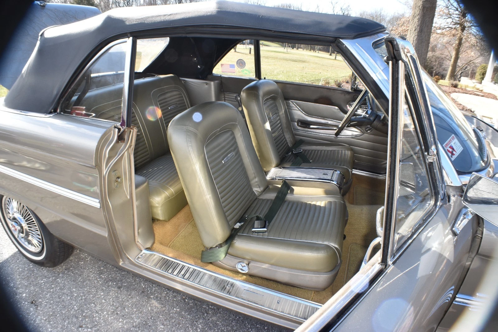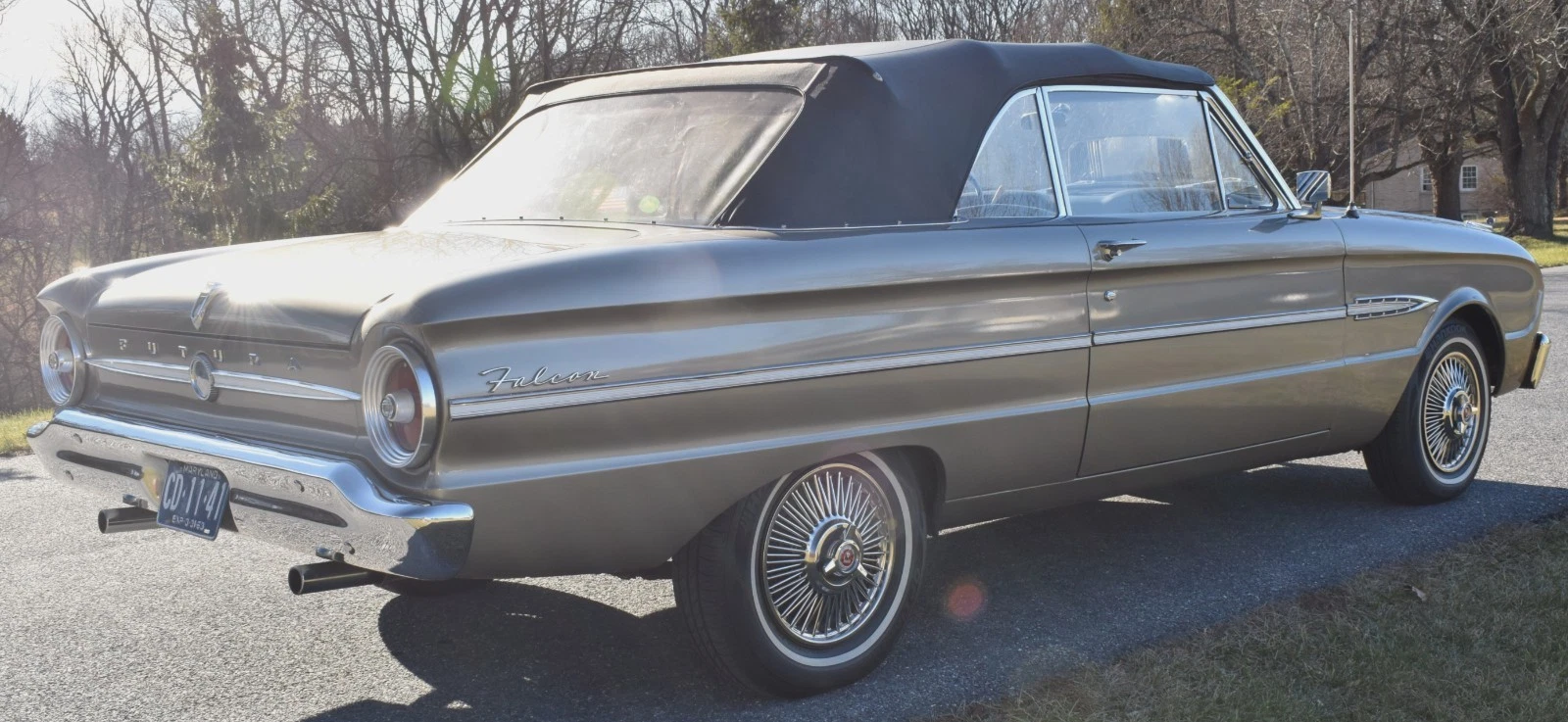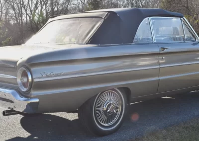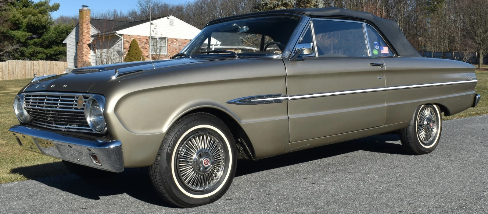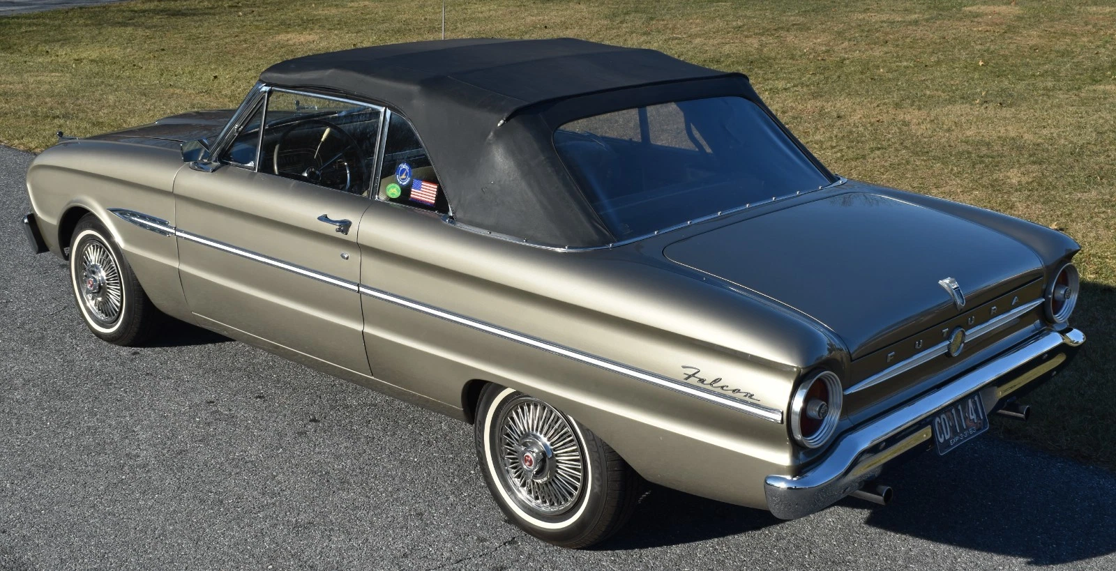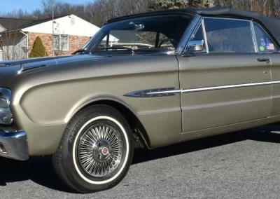 1963 Ford Falcon Futura Convertible in the original Champagne metallic gold and black top. This Futura originally came powered by a 170 cu in I-6, but now has a .030” 289 cu in Windsor, backed by a C4 automatic transmission and 8” Ford differential!!