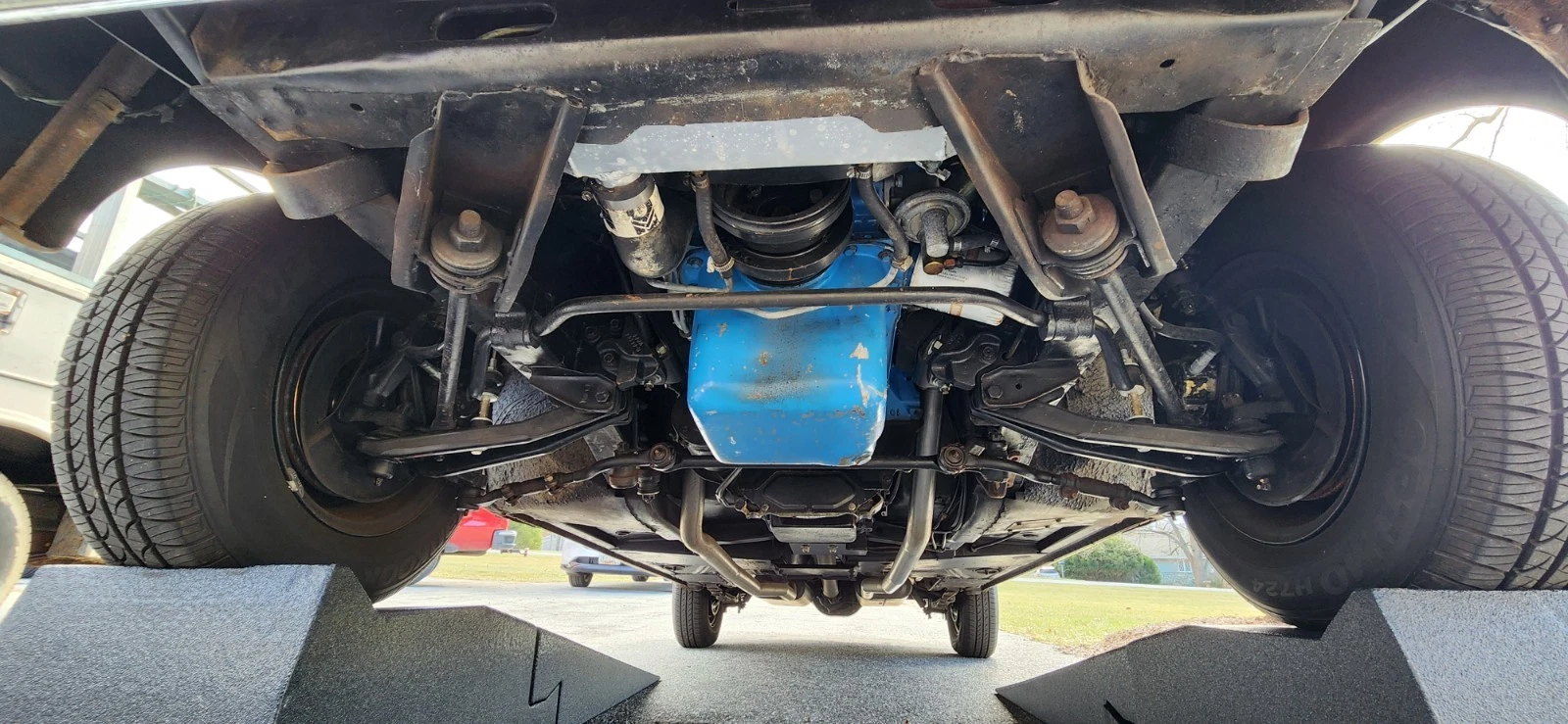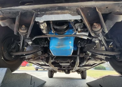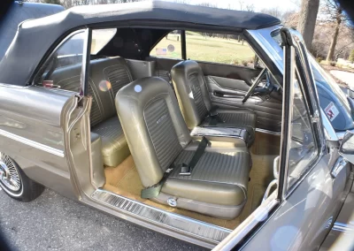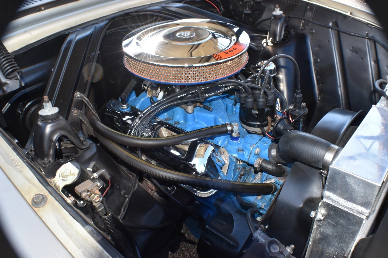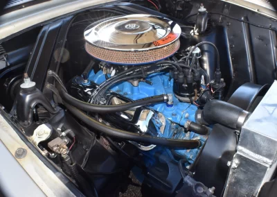 • Rebuilt 289 cu. in. Windsor Ford engine with a mild hydraulic cam. A Holley 600 cfm carburetor sits on top of a stock intake manifold, and a Pertronics ignition has been added. Aftermarket aluminum radiator keeps the car cool. Dual exhaust exits the rear using Flowmaster 3 mufflers.
