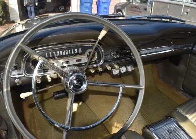 The interior appears to be original and in excellent condition. Vinyl seats and door panels have no tears or broken seams. There is some ‘patina’ on the metal of the upper sections of the inside door panels (see photos). The factory wipers, lights, speedometer/odometer, fuel level, and temperature gauges function. Aftermarket water temperature, oil pressure, and voltmeter were added. Also, the AM/FM/Cassette player works.