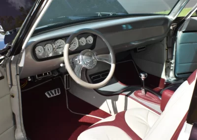 Interior: Burgundy and gray custom leather upholstery on 1998 Mustang bucket seats in a surround console moved back to allow more leg-room. Suede headliner, plush carpeting, custom and filled one piece dashboard with Teleflex Genesis Haneline gauges, Billet Specialties steering wheel, and under the dash hand controls for A/C & heat.