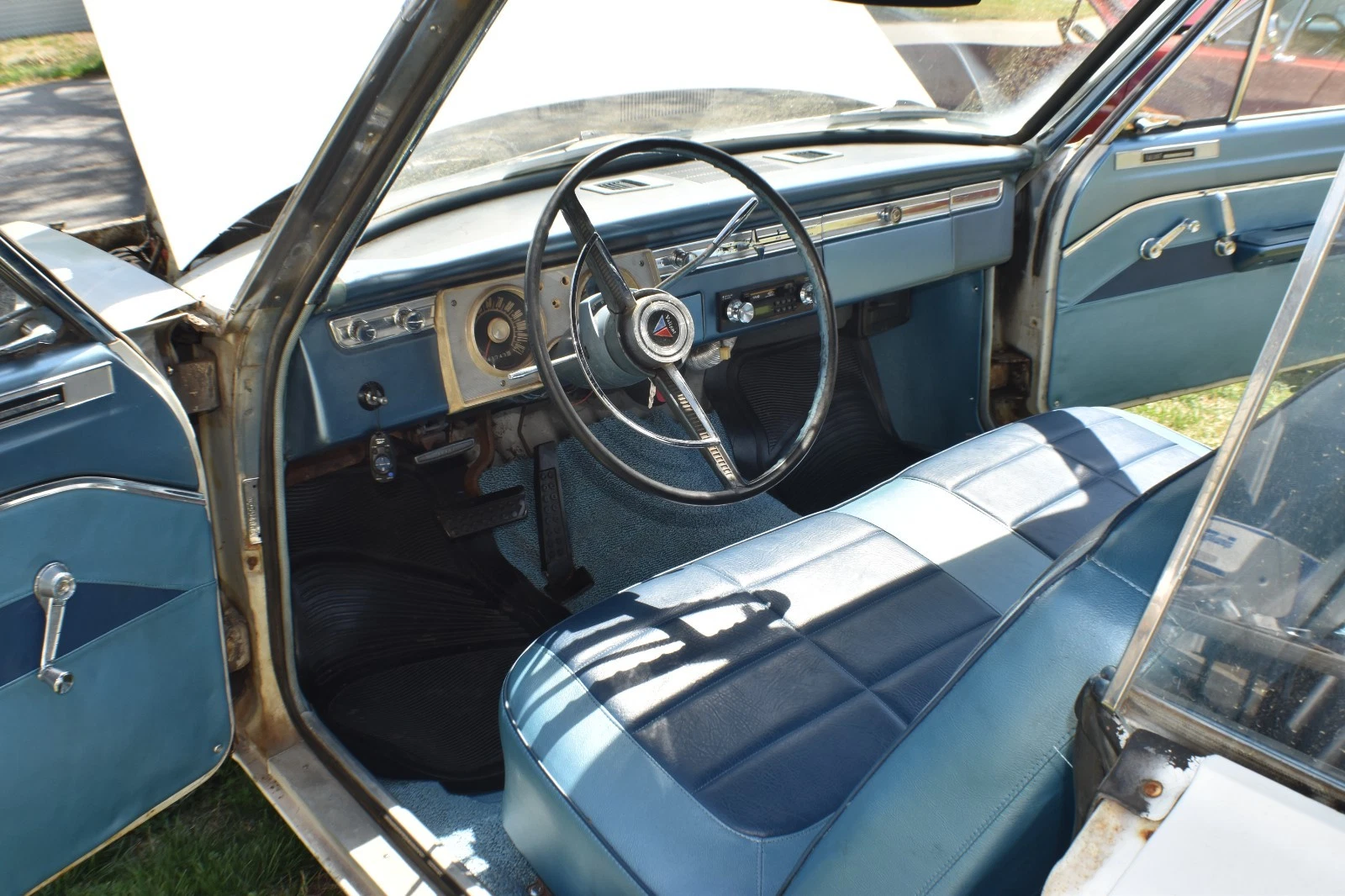 The owner was going to restore it for his wife, but nothing has been done to the body of the car, but it appears the interior has had the seats recovered and new carpeting added. It also has a 4-speaker stereo system with the player mounted in the glove box.