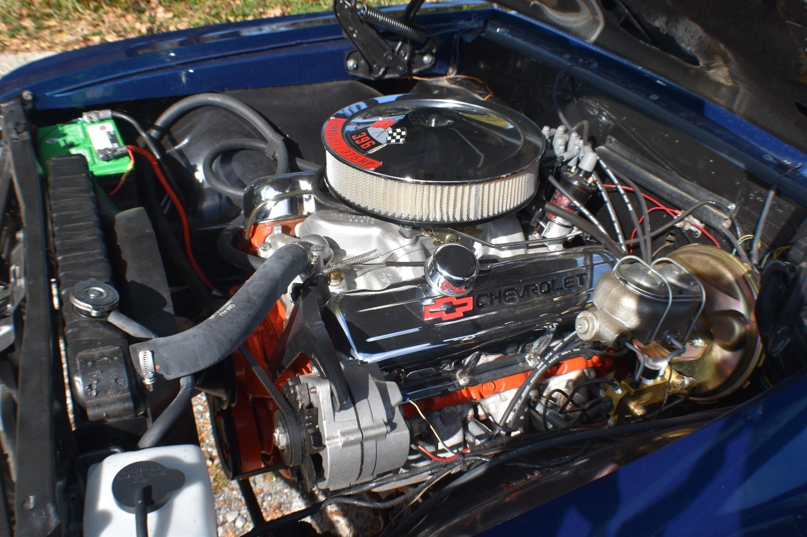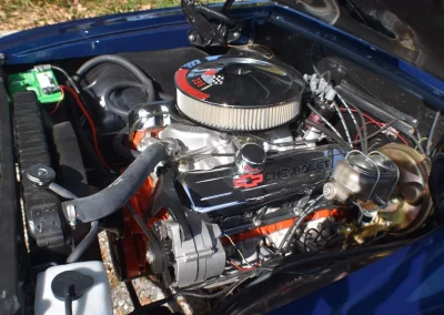 396 cu. in. Chevy engine with a mild hydraulic cam, MSD billet distributor with Blaster coil, 375 hp Winters aluminum intake manifold, Edelbrock 700 cfm carburetor, stock exhaust manifolds with 2 ½” exhaust and FlowMaster mufflers.