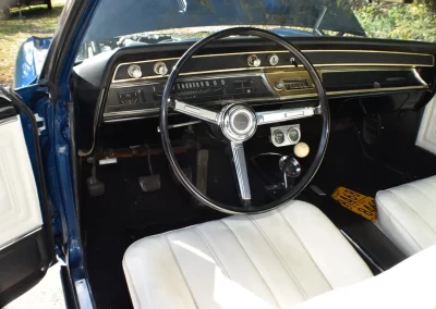 The original color of the car was Marina Blue, but now it sports a 2-stage dark blue metallic paint job. The floors in the trunk were replaced and there appears to have been some bodywork above each rear fender panel. The passenger floors appear original. There is no evidence of bubbling or rust only a couple of chips and a ‘dipple’ in the hood from a tall carburetor stud. Please note the windshield is cracked.