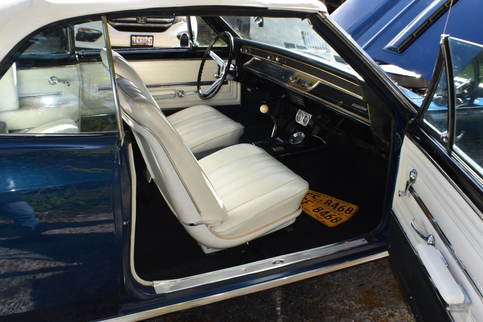 The white seats are original and in excellent condition. The door panels, and dash are also original and in good condition. The carpeting was replaced when the rebuild was done. The factory and aftermarket gauges function, only the console clock does not work.