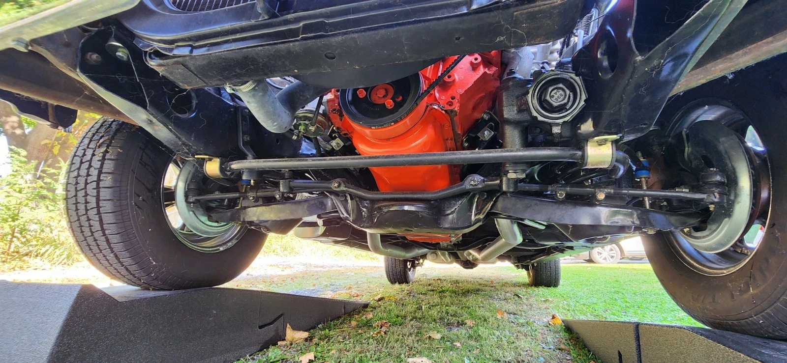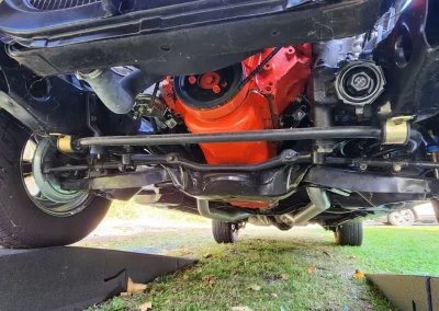 The entire suspension appears to have been redone including the power brake system (discs front and drums rear), springs, shocks, ball joints, tie rod and sway bar ends. The bushings are polyurethane. The stock front upper control arms were replaced with custom tubular pieces. New body mounts with rubber gromets were also installed. The 12-bolt rear differential looks rebuilt and is running 3.31:1 posi-traction gears.