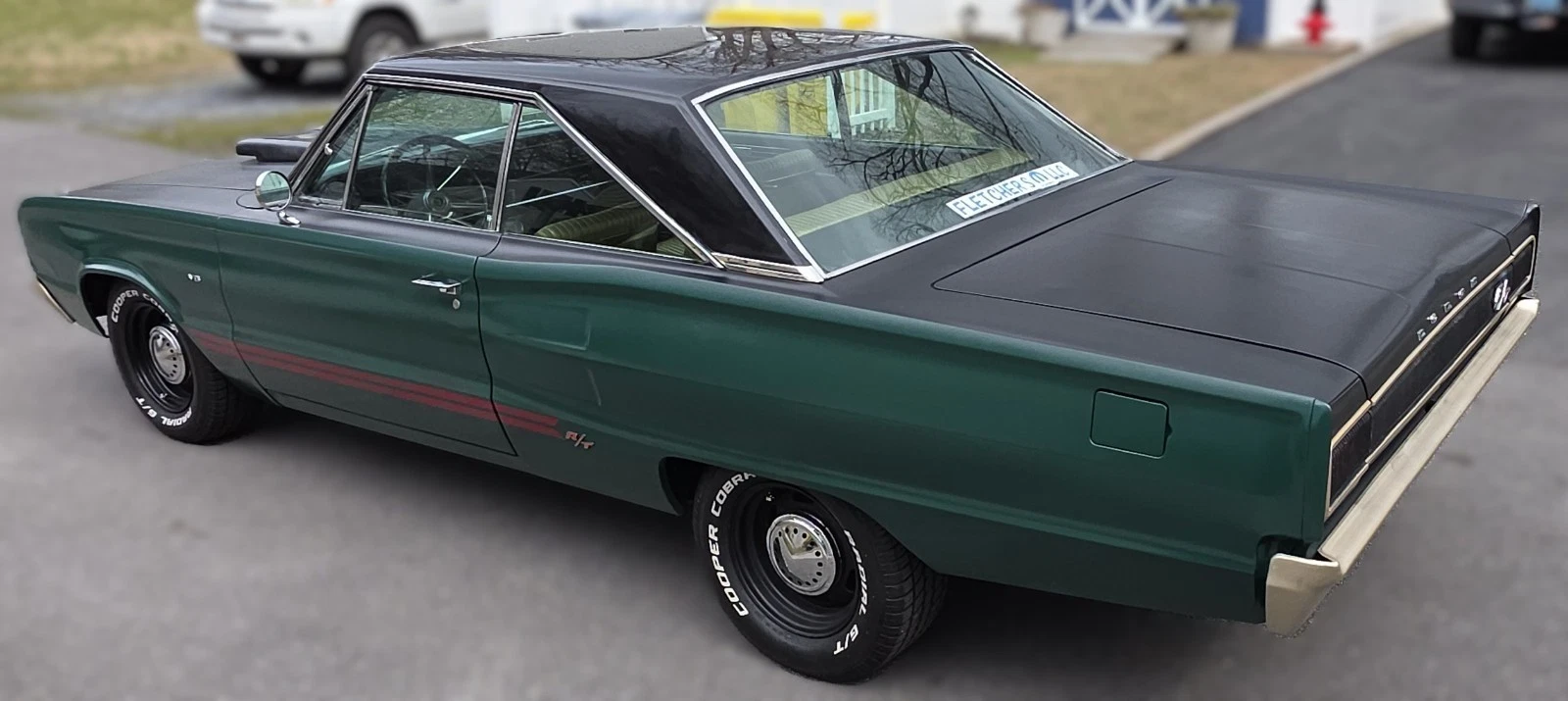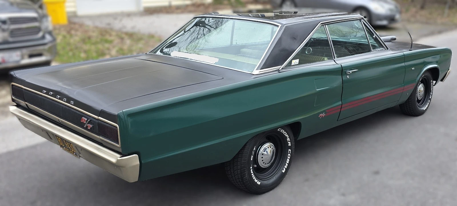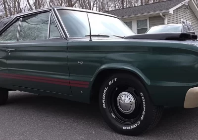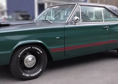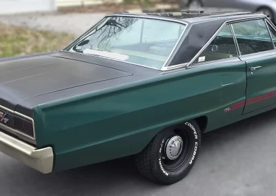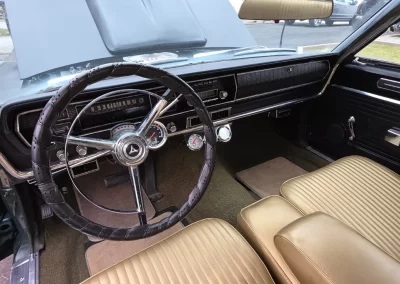 Stock Dodge Coronet suspension with new ball joints and complete brake system (drums on all four corners). Air shocks were added in the rear. 8.75” rear differential housing new 3.55:1 ring & pinion with posi-traction. Cooper tires measuring 225/70R/15 up front and 255/60R/15 rear on stock 15” wheels with ‘dog dish’ hubcaps.