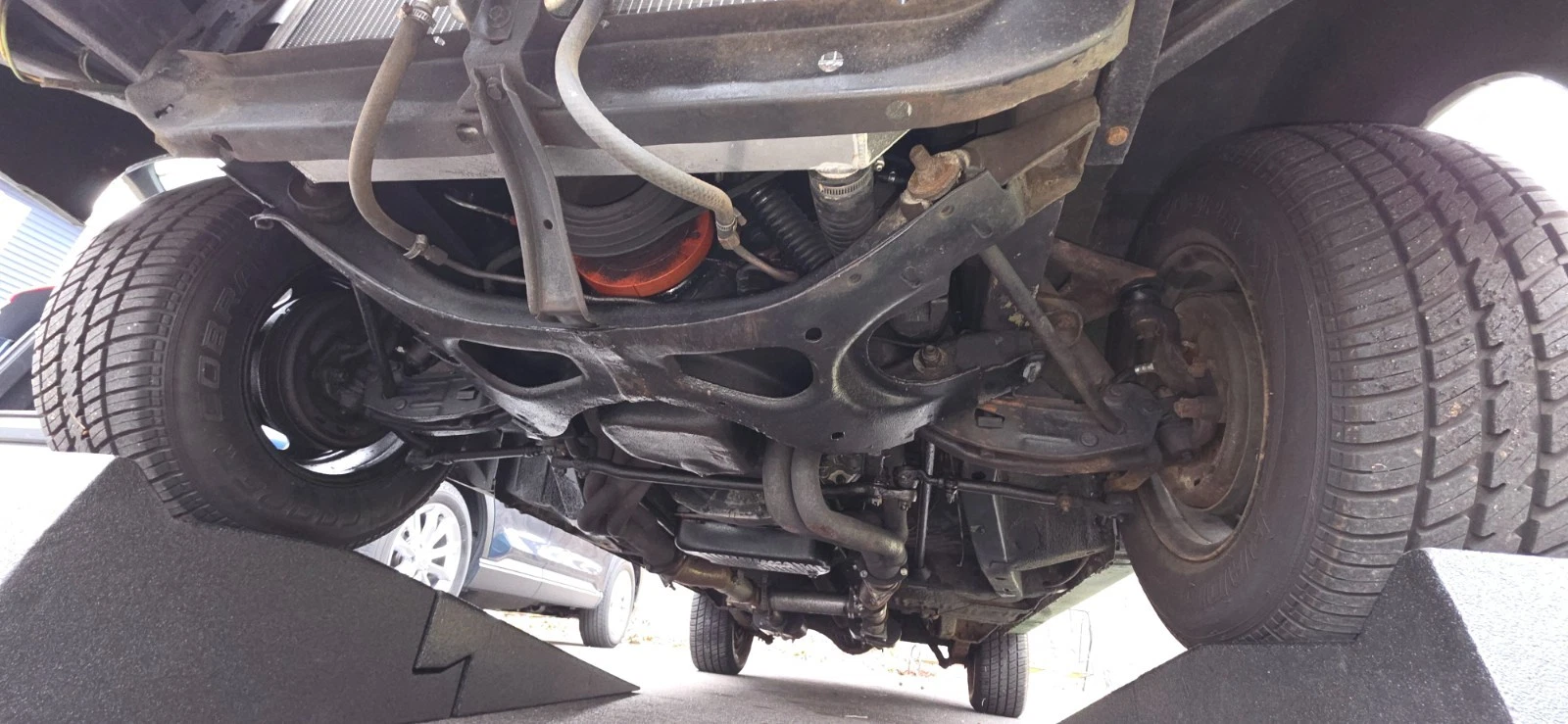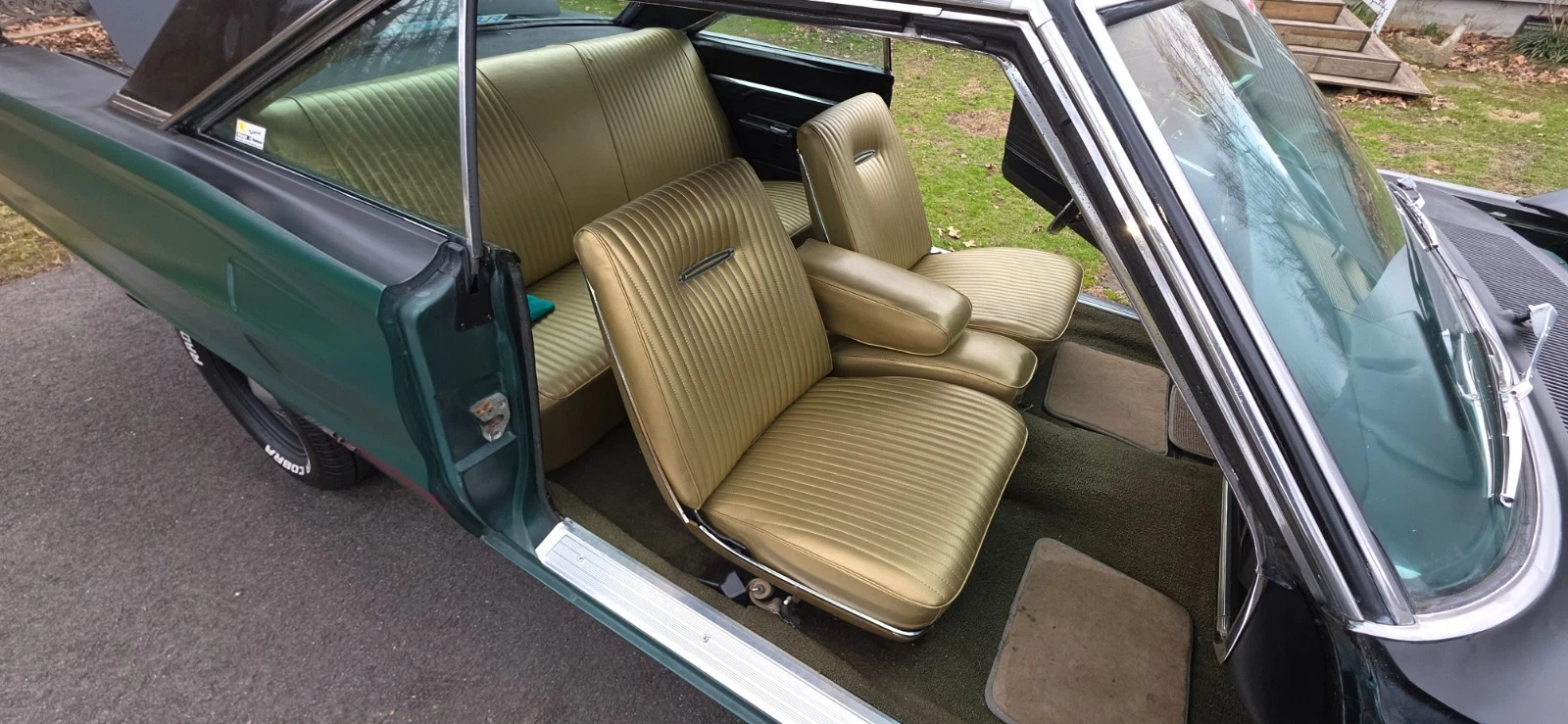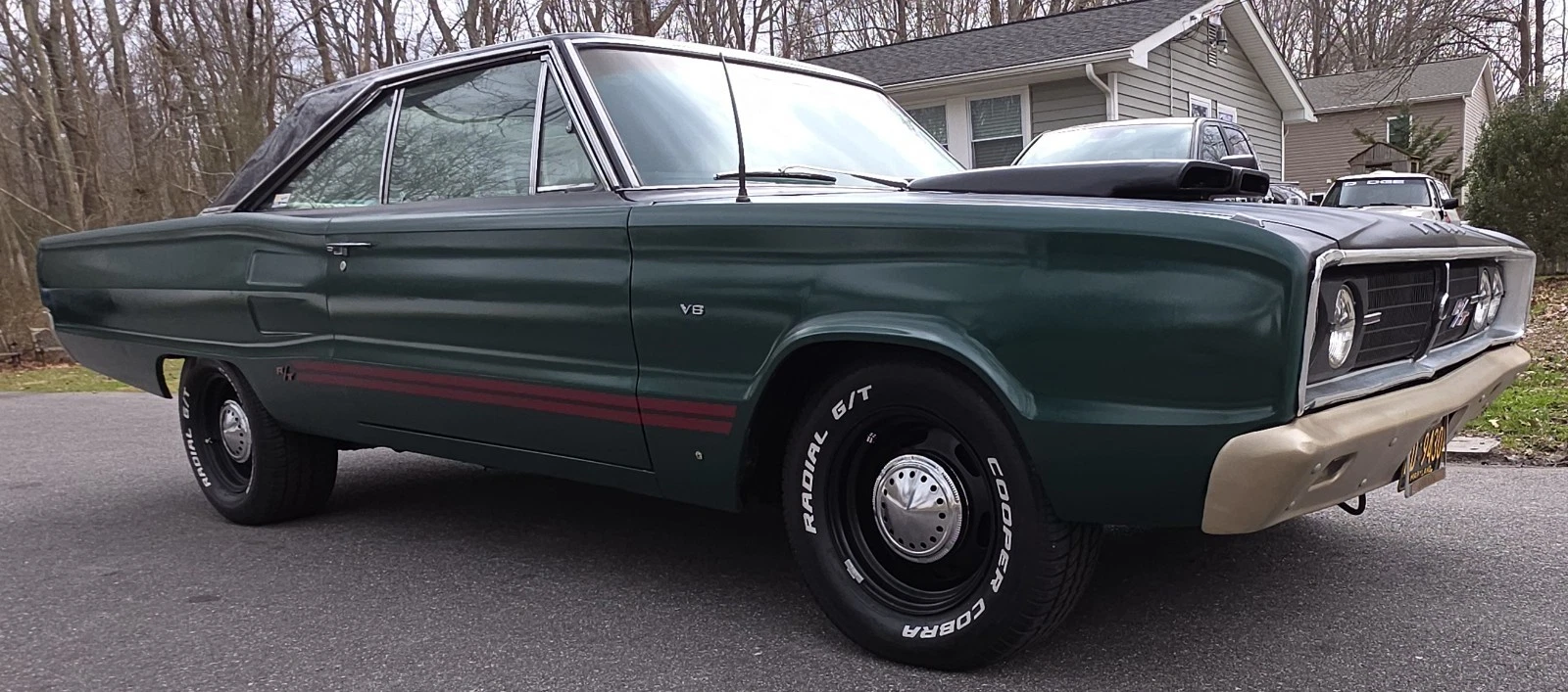 Stock Dodge Coronet suspension with new ball joints and complete brake system (drums on all four corners). Air shocks were added in the rear. 8.75” rear differential housing new 3.55:1 ring & pinion with posi-traction. Cooper tires measuring 225/70R/15 up front and 255/60R/15 rear on stock 15” wheels with ‘dog dish’ hubcaps.
