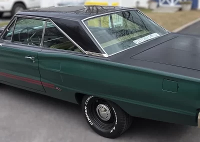 Overall, the Coronet body is solid and original. Mileage shows 60,000+, but no evidence of ‘bondo’ or replacement panels. 1970’s vintage Mopar hood scoop. You can see side trim holes under the red striping on each door. Finish is a ‘Hot Rod’ flat with a gloss black top. All glass is in good condition and goes up and down easily. Outside lights function as well as the wipers. Chrome bumpers are painted and the rear taillight section shows some pitting.