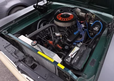 Rebuilt 1970 340 cu. in. V-8 with a .480 lift hydraulic flat tappet cam, Holley 650 cfm carburetor, Weiand intake manifold, electronic ignition, custom aluminum radiator, headers, 3” exhaust with Dyno Max mufflers.