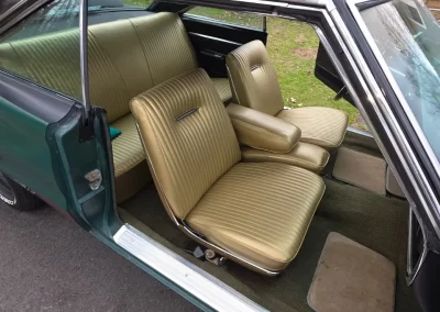New ‘Legendary’ upholstery on front and rear seats. New carpeting and headliner. Original dash is in good condition. Factory speedometer/odometer, fuel gauge, and turn signals work. Owner added aftermarket Oil pressure and water temperature which work, voltmeter is not connected. Original door panels appear to be in good condition.