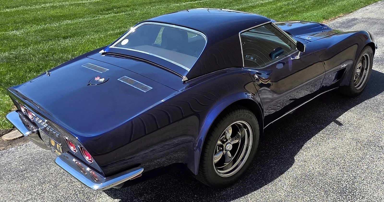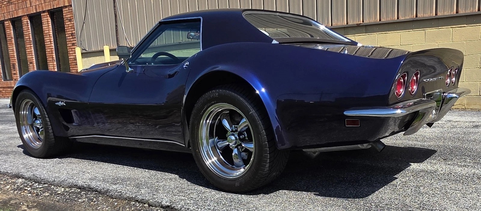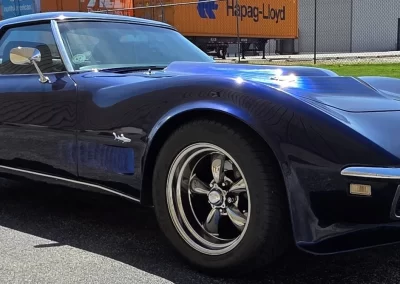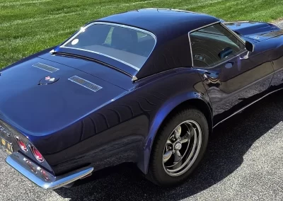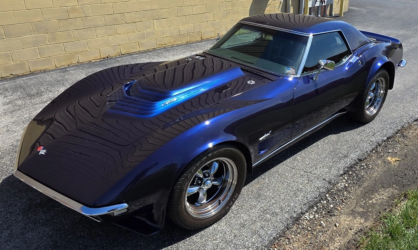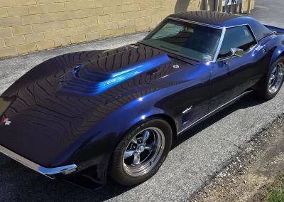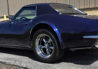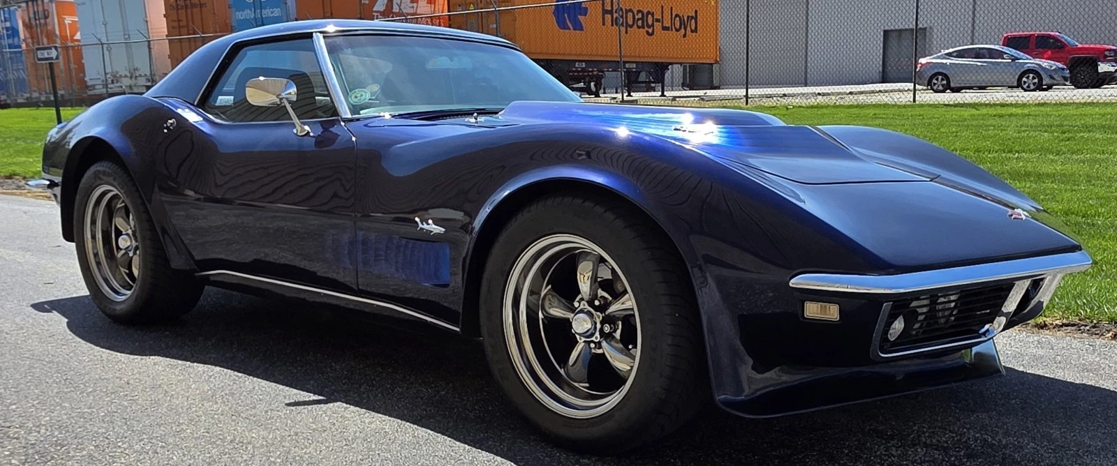 For sale by a private party is this beautiful dark metallic blue 1968 Chevrolet Corvette Convertible powered by a 500+ horsepower 454 cu in Big Block backed by a Tremec TKO 600 5-speed transmission. This Corvette has many unique features like an electric parking brake, custom bucket seats, Hot Rod A/C, HID headlights, and customized suspension.