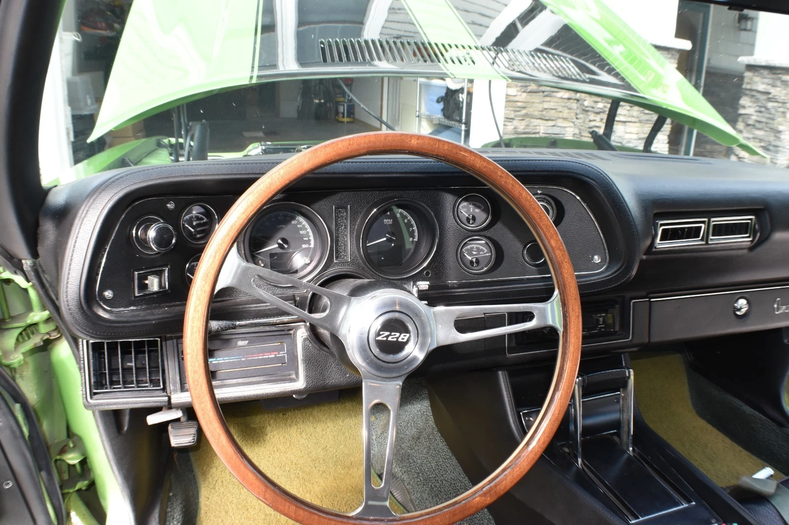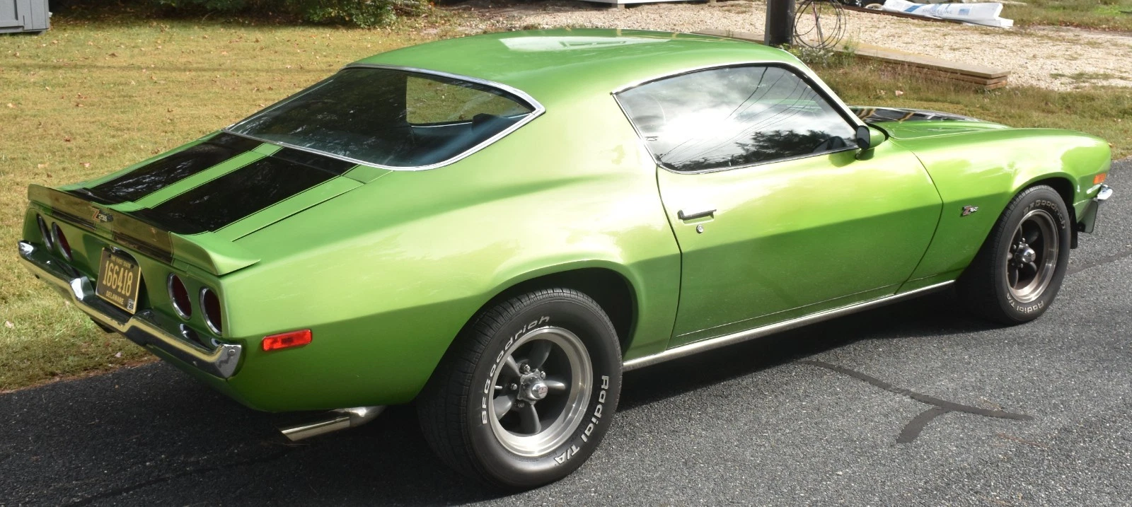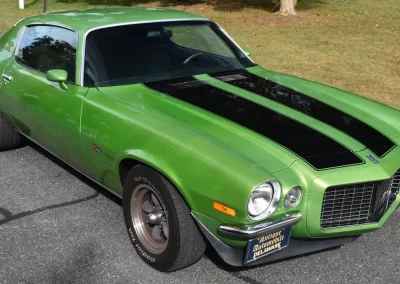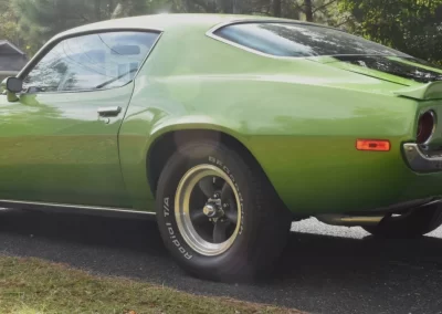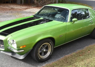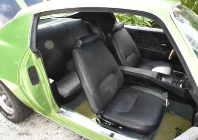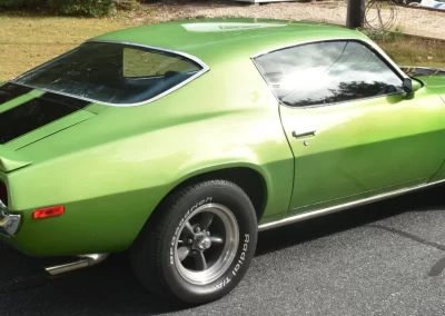 The Camaro started as a Citrus Green RS and was built in the Van Nuys CA plant. The present owner bought the car from a dealership in the mid-west shortly after it had been restored. It appears that all of the body panels are intact and there is little to no evidence of ‘Bondo’. The 2-stage urethane paint looks great, and the stripes are under the clear. There are some flaws and chips, so please view all the photos.