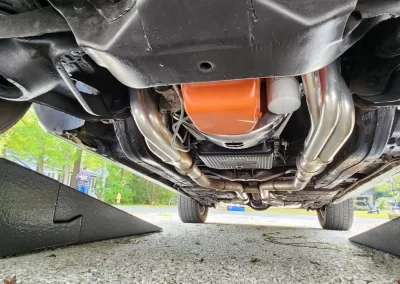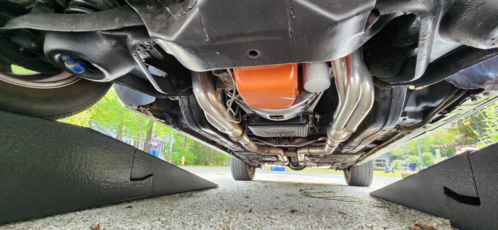 The Chevrolet 350 cu. in. V8 ‘crate’ motor is rated at approximately 350 horsepower and apparently had an after market hydraulic cam added for a little more “thump” at idle. It sounds good and runs strong. Other options include an HEI ignition, ceramic coated headers, and a 750 cfm double pumper carburetor. New exhaust systems uses single large muffler and 2 ½” exhaust like and original Z/28.