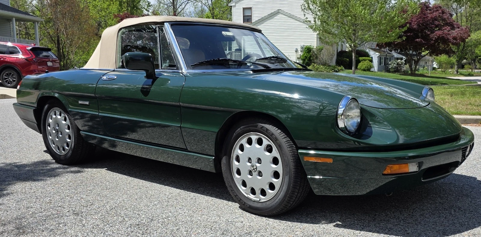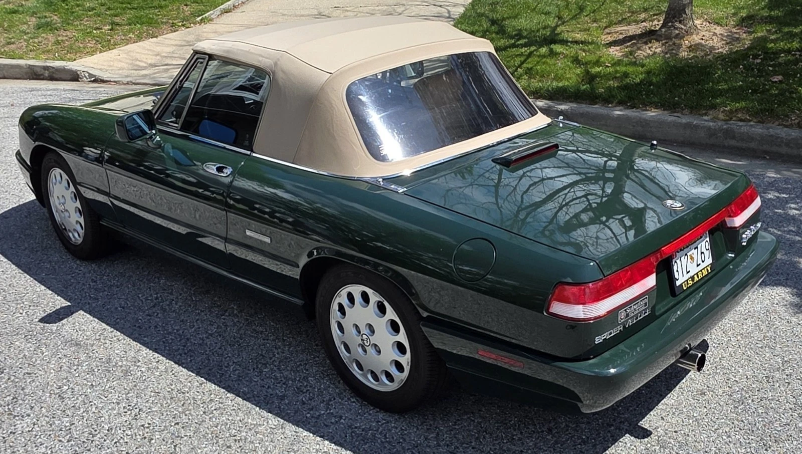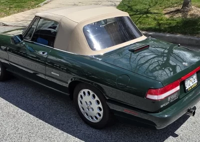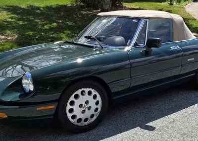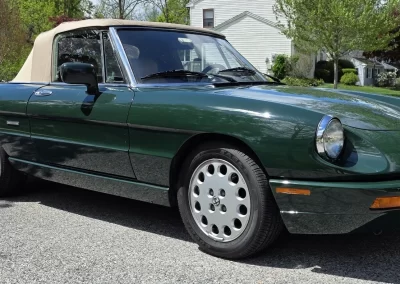 1991 Alpha Romeo Spyder Veloce in its original British Racing Green with matching tan vinyl bucket seats and powered by Alpha’s legendary DOHC (dual overhead cam) 2.0 L 4-cylinder rated at 120 horsepower with a 5-speed manual transmission. This roadster has a clean Maryland title and only 52,300 original miles.