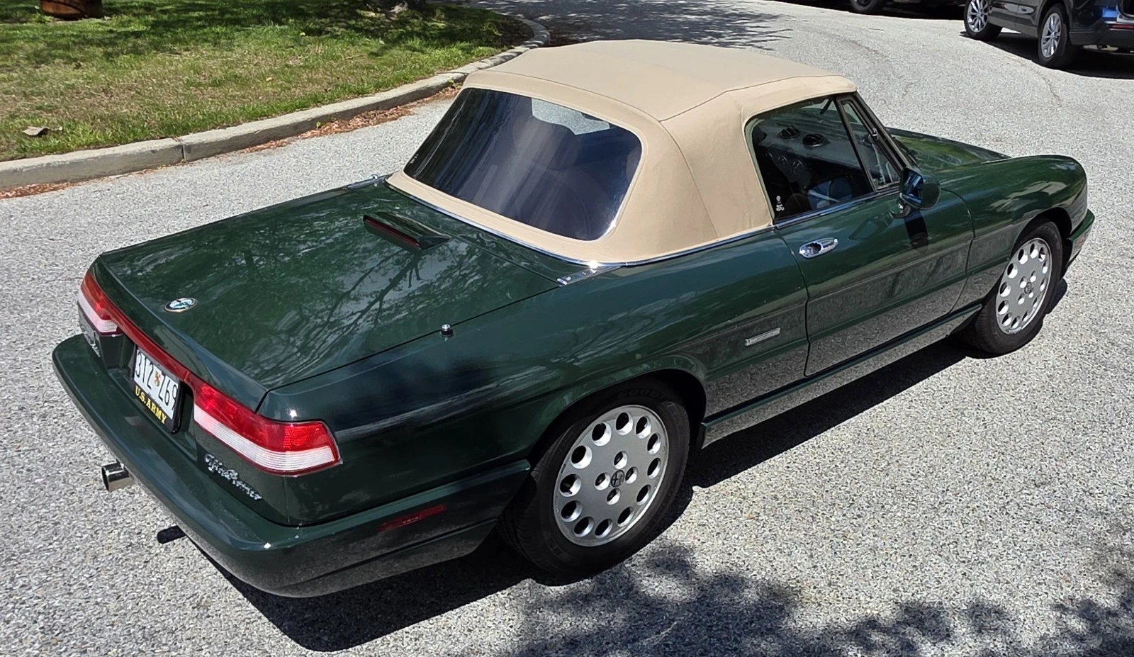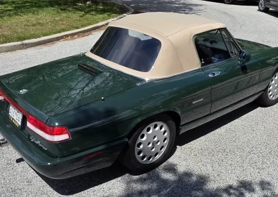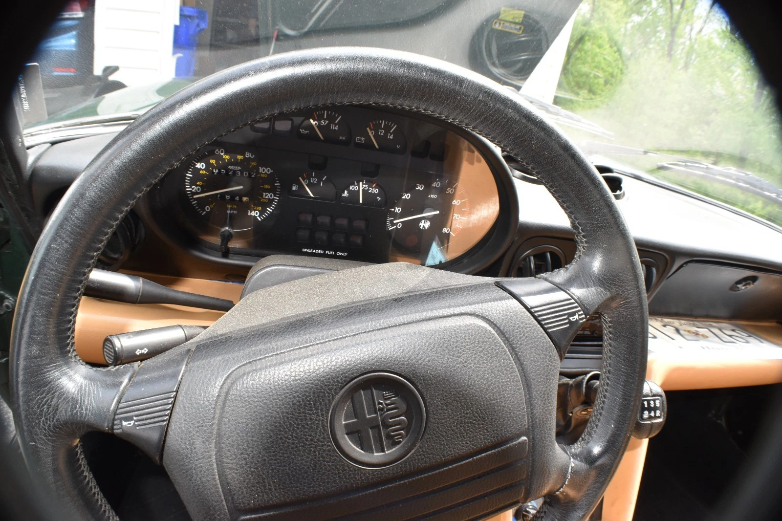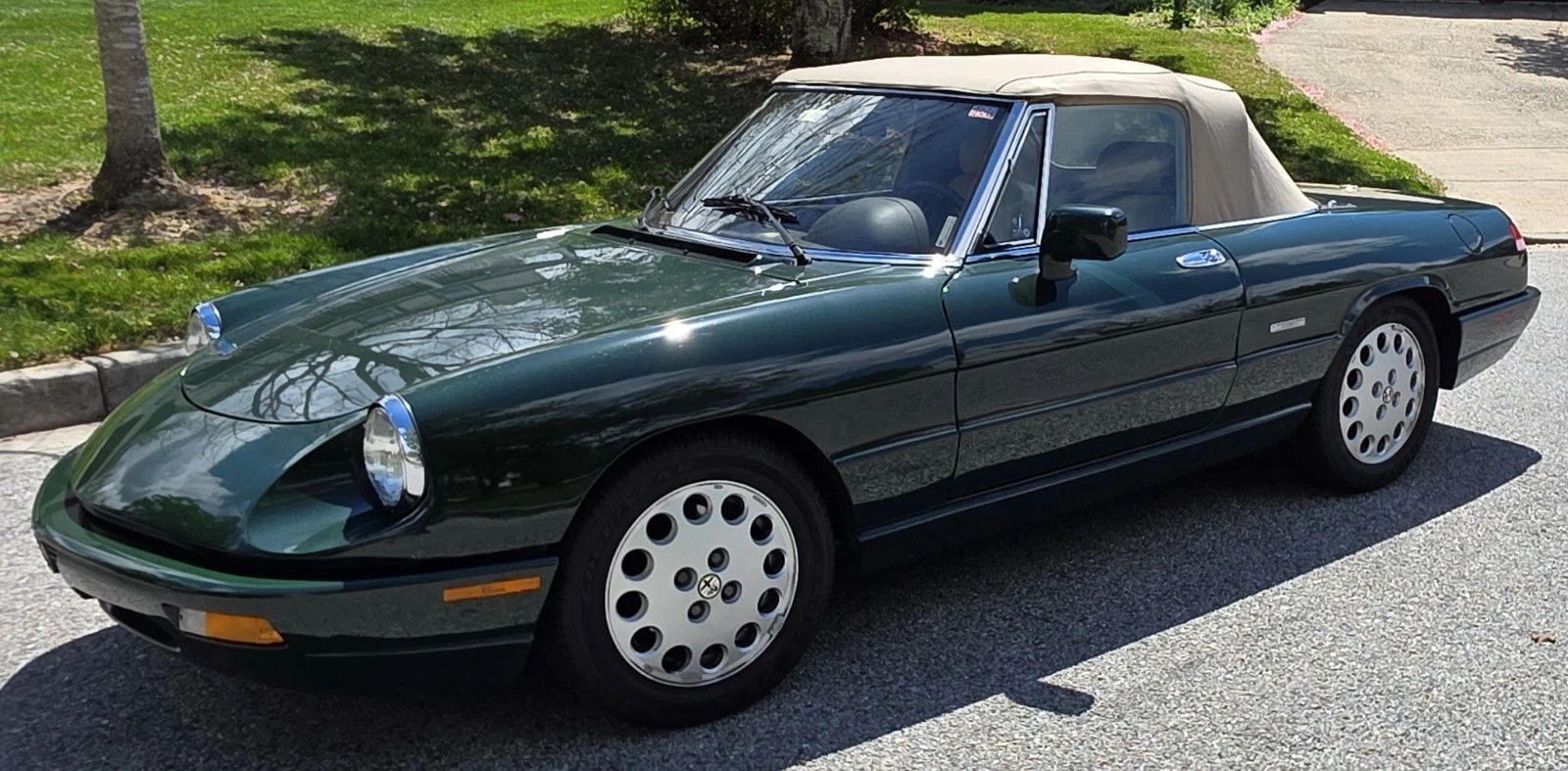 1991 Alpha Romeo Spyder Veloce in its original British Racing Green with matching tan vinyl bucket seats and powered by Alpha’s legendary DOHC (dual overhead cam) 2.0 L 4-cylinder rated at 120 horsepower with a 5-speed manual transmission. This roadster has a clean Maryland title and only 52,300 original miles.